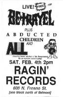 ABDUCTED CHILDREN started in the late 80s and were together for a couple of years. Evolving into several more bands over the years well into the nineties and the new millenium. I remember Matt and Damon from my old hood in Clovis back in the 80's. I used to see dreadlocked Matt on his bike. Damon was one of the best singers and hella frontman (already) in the Fresno area punk bands at that time. Turtle went on to play bass in SLUT VINYL. I'm looking for more background on how ABDUCTED CHILDREN got together, photos, etc. Abducted Children evolved into CONFIRMED 187 and eventually became I,MADMAN. Damon being the lead vocalist in all three bands. |