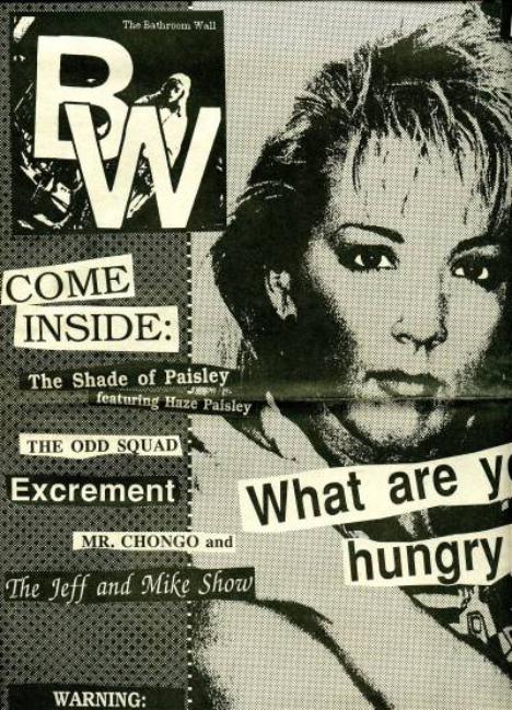 Bathroom Wall 11.5x15 offset newsprint 12 pages free 1989 Testing the limits of free speech this edgy zine had cool photography, professional layout and lots of smutty, funny cartoons. One issue looks as if it's a different zine called Danglecrank. Open it up, it's actually Bathroom Wall #4! Lots of railing against other zines, lame record stores and sucky radio stations. Favorite slag: 'Butt Cretins'. Comical and clever. Pre-CIRCUS BOGUS, Chief Horseman of the Apocalypse: Jeff Purcell. Mike 1, Mike 2, Martin Reese, Jaguar Bennett and Tim Biskup among others contribute.