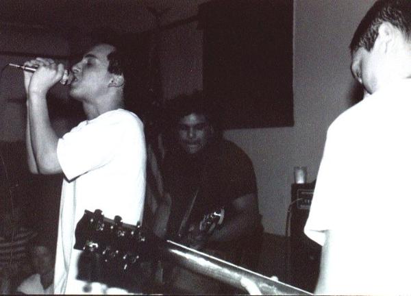 THINK TANK lineup2 1983 Knights of Columbus hall Fresno Gregg Mitchell-vocals Bobby Arias-bass Mike Waldhart-guitar Matt Dunlap-drums (off camera) |