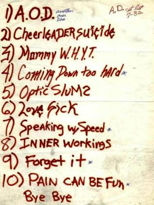 | Originally started out as THE ROVER KIDS but, with  changes in band members the name was changed to ASSERTIVE DISCIPLINE and then shortened to just A.D. Keith played in several other early Fresno punk groups: CAPTAIN AMERICA and the AVENGERS included Gary Schuster-guitar (from THINK TANK) and Matt Sobenes-drums. THE GRENADES was another group Keith played in. One of A.D.'s more memorable songs was 'Killer Cops from Hell" which was covered by HATED PRINCIPLES. HP were an 80's punk band from L.A. which featured Keith's sister on bass and sax and Katz Seki (noted L.A. photographer and musician) on guitar. A.D./GRENADES/CAPT AMERICA happened about '81 to '84. They played at the Roeding Park gig in '81, the Clovis Warehouse several times 82-84, and some other gigs and house parties.  |