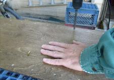 | The strings must slap against the Tapa to make the slapping sound, so they have to be touching or lying against the Tapa. Here I drilled holes for the strings and cut some grooves with a metal file to further seat the strings right against the Tapa. It was a trial and error process to find the best position for the strings. The hardwood frame was so much more stable than the soft plywood. |