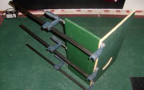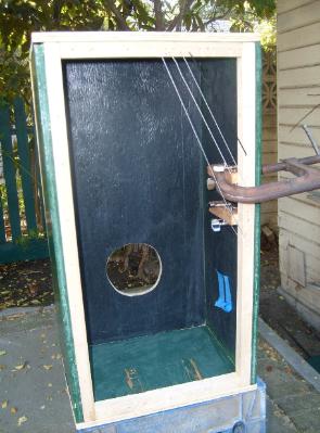 | I neglected to photograph the cutting, glueing and clamping of the hardwood frame, which was made of 3/4" square dowels from Orchard Supply hardware. But, once that was accomplished it was just a matter of glueing and clamping the frame to the sides of the body. There again the crooked lines in the sawing of the three sides made for problems at this juncture. But, with enough clamping it was forced into contact, no matter how not square it was. |