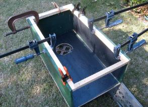 | Bar clamps holding the sides glued with wood glue. I let them dry overnight, but found out just an hour or two in fall weather would have been enough time. |