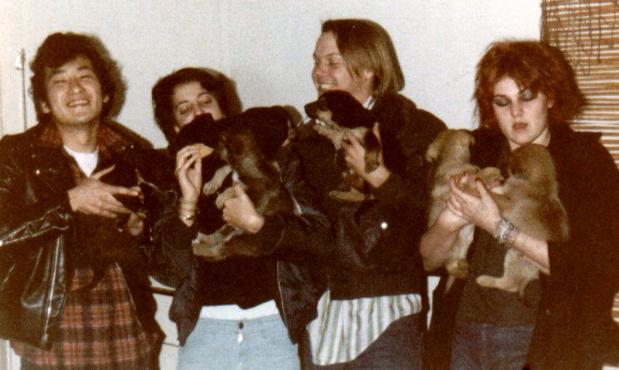 Eric, Annelle, Steve and a friend holding puppies. 1982