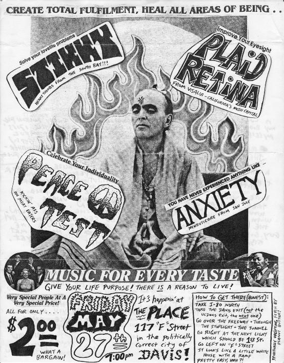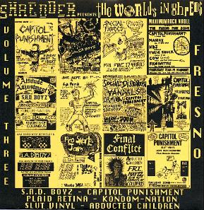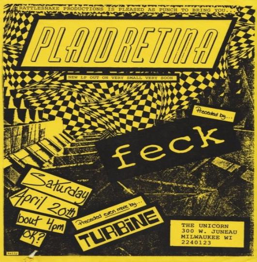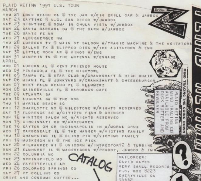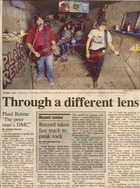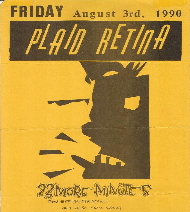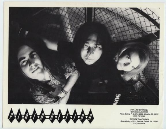 ike a hurricane out of the south Valley came this three-piece that played some of the fastest and shortest songs of the day. They fit 12 songs onto their debut 7-inch on Lookout Records! Recorded in '86, released Lookout #7 in '87. I was priviledged to be in Grey Gregson's Audio Image studio in Fresno with them when they recorded that cool slab'o'wax. PLAID RETINA had a long and fruitful career first as a straightahead, fast punk band and then morphed into a style of music that really defied description. With elements of prog-rock and jazz mixed with punk they were on the cutting edge of the late 80's-early 90's punk scene. Of all the 80's punk bands from the Fresno area they toured the most. They toured constantly for several years playing all over this great land. I remember getting postcards from Matt from places like Texas and Virginia. This is a band to ask tour stories about. Playing so many gigs all over the U.S. they've had the most outrageous and funniest experiences. They put out a lot of records and CDs, too. First on Lookout and then David Hayes' Very Small Records and also Fresno's Duckbutter Records run by Tim Biskup. CP played several gigs with and I watched them perform many times. They were a one of a kind type of band with a natural flowing talent. I think that's why they were so successful. From short bursts of teen punk angst to grand multilayered harmonies and exotic rhythm structures they covered a lot of ground in the years they were together. And it didn't hurt none too much that they worked so hard at it. |
