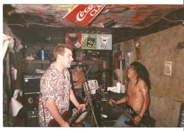 In the rehearsal room - a real train boxcar that was fixed up w/insulation, drum riser, carpet and electricity. |